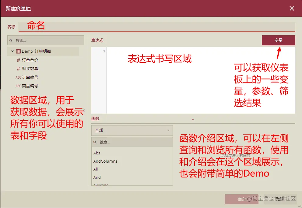 度量值:度量值需要做一定的聚合运算,它会在你绑定分类的基础上,去计算你设置的表达式,所以更多是在维度分析的基础上做计算分析,产生的结果也只能被用在数值字段上,因为其中的数据本身就是被计算出来的结果。