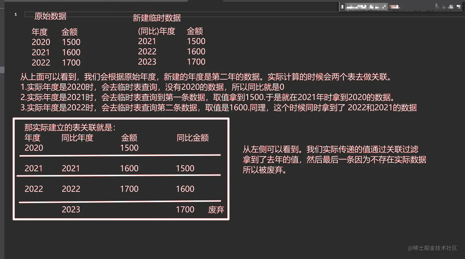第二个表达式先用新建的表做一个金额的求和,然后再去过滤“年”字段(values[年度])。因为实际取值的时候,会根据关联过滤,取到对应同比的值,再去计算同比即可。具体可以参考下面图解。