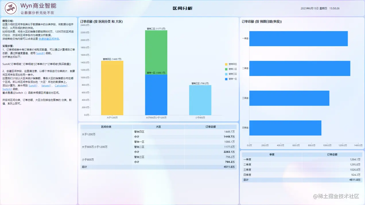 在经营分析场景中,往往会看到满屏的销售数据,不同地区的销售额度杂乱无章的摆放着,没有做任何区分。这个时候就需要对最终的数据做区间分析了。比如想知道销售额度在100w-200w的有哪些地区,200w-300w的哪些地区。