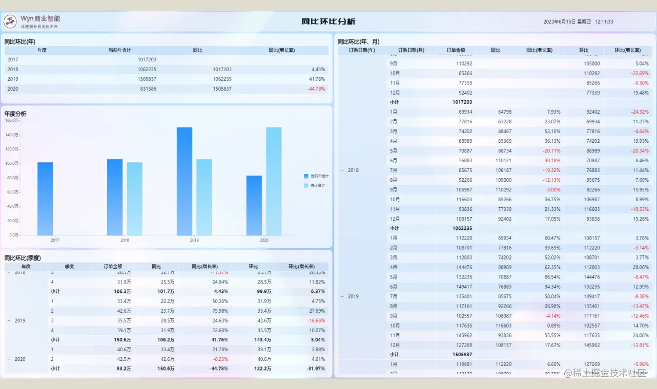 相信在很多分析场景中,同比和环比永远都不会缺席,无论是在月度分析,季度分析还是年度分析的。大家都会关注相对于上个时间维度,或者同期维度的变化情况。这也是基础的、领导想看到的数据对比方式。