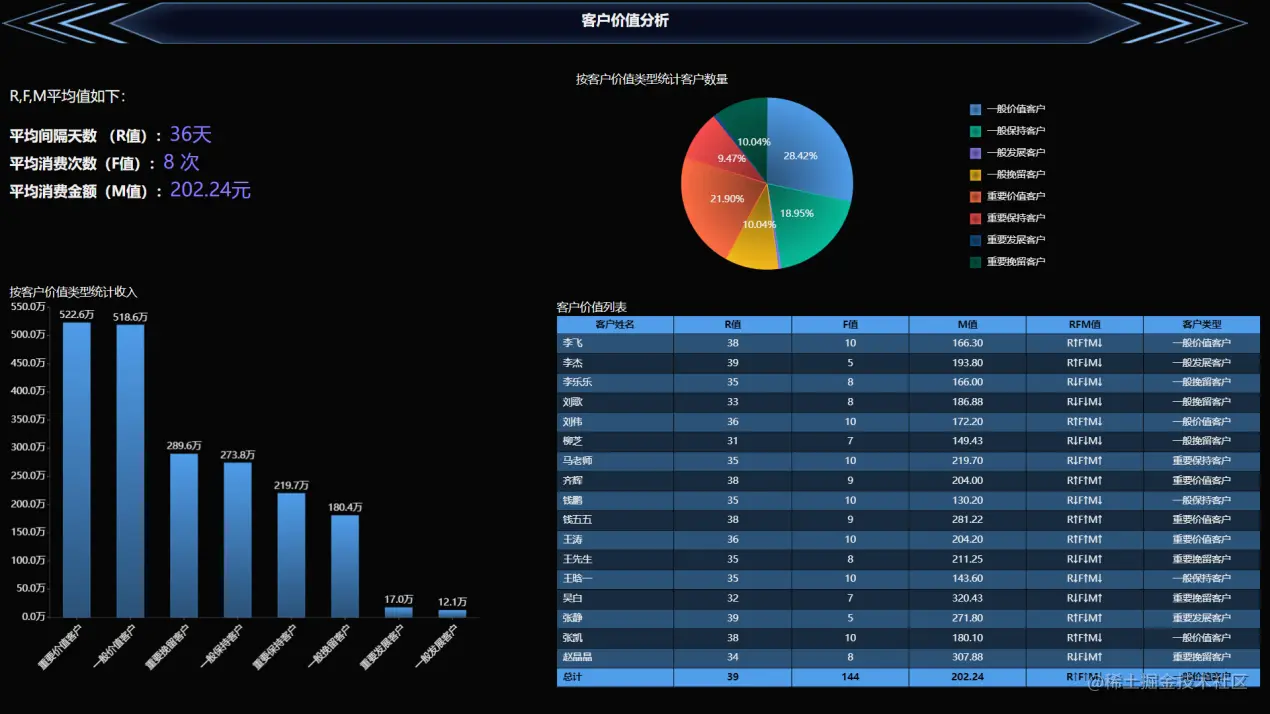 到此为止,一个客户价值分析的数据模型便已经成型。一起来看看最终的展示结果吧: