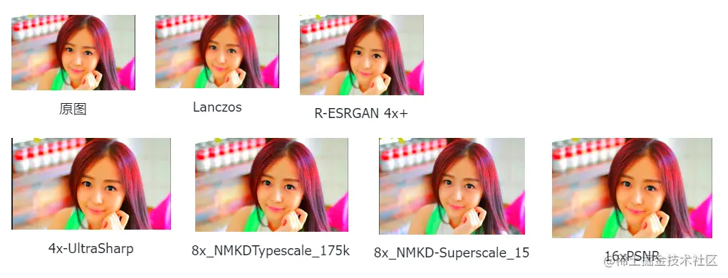 分别使用了传统算法“Lanczos”、常用算法“R-ESRGAN 4x+”,以及刚才下载的四个新算法进行了对比。
