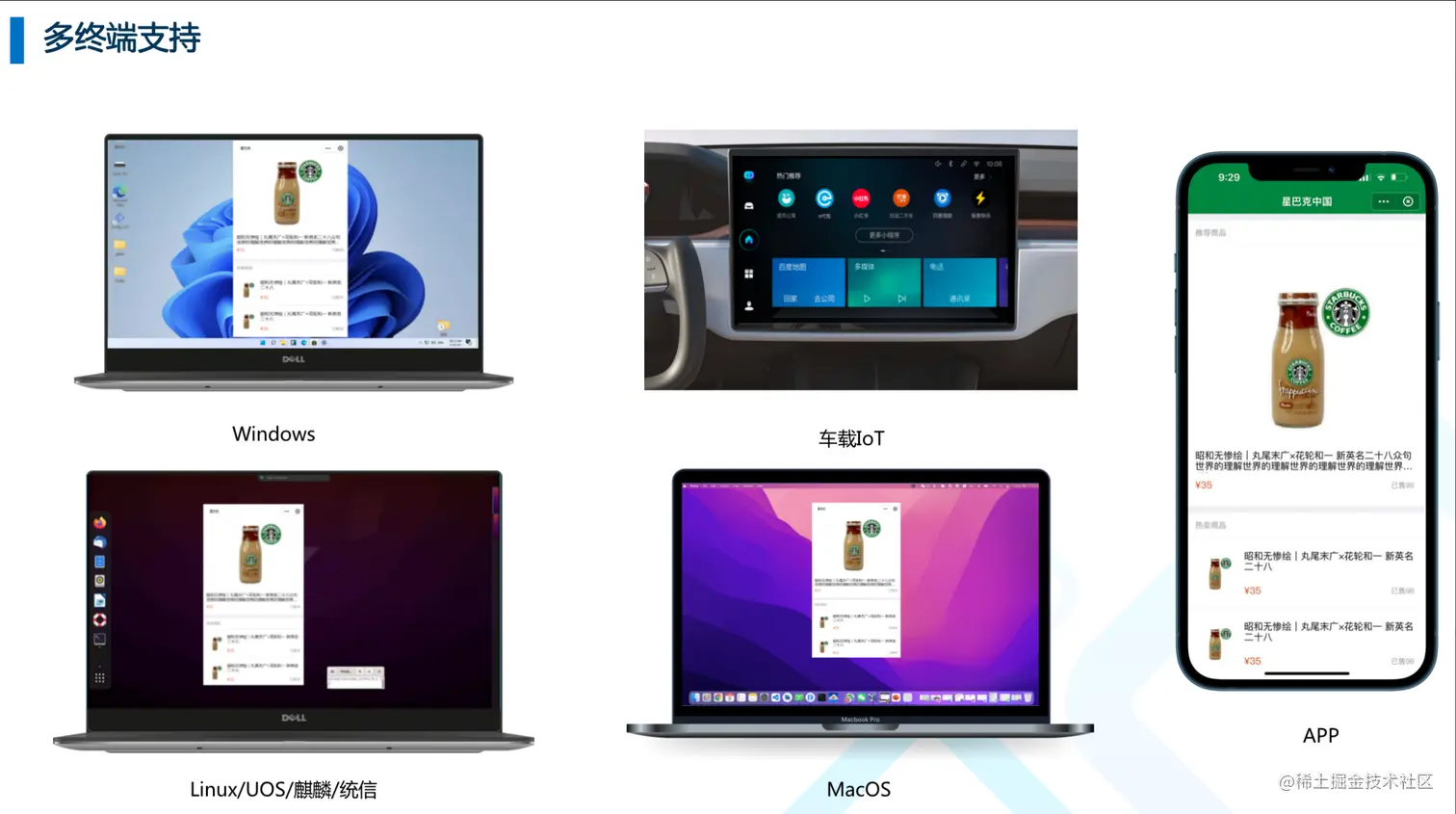 不仅如此,FinClip 还支持手机以外的多种终端,包括 Linux、Windows、MacOS、麒麟等操作系统。这意味着,PC 端、车载设备、智能电视都能使用小程序了,实现了小程序的“一次开发,到处运行”,同时触达众多流量平台,而不仅仅局限于微信生态。