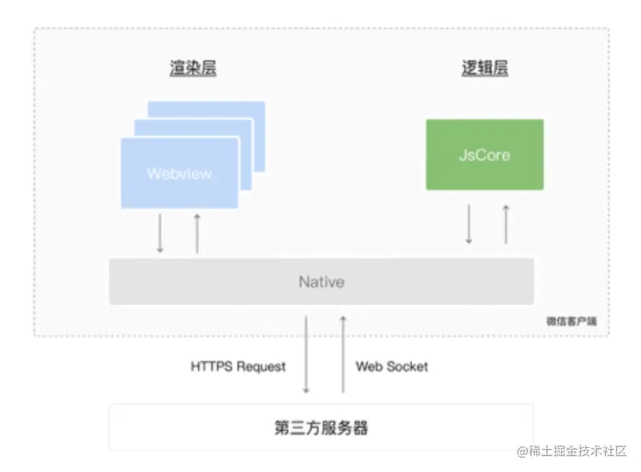 小程序在JS-SDK的基础上,一方面进一步开放和拓展原生的能力给到Web前端调用,另一方面,页面渲染(Webview Render)的UI层和逻辑层,使用了两个独立的线程。如下图所示: