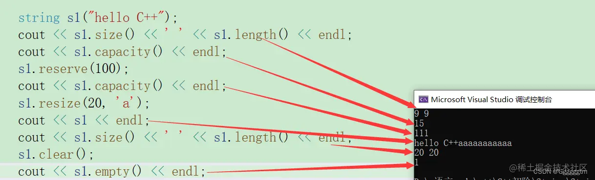 注意: capacity返回的是空间的总大小, size和length返回的是字符串的实际有效长度。 两者是有所区别的。一个字符串的capacity是有底层的具体实现决定的,不同的编译器可能实现的是不同的。