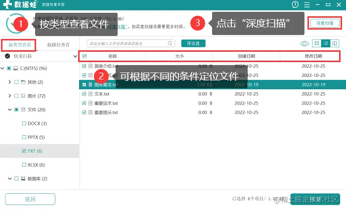 2.等待第一次扫描结束,可以点击左边【按类型查看】对扫描结果进行查看和选择,文件展示会比较简单,我们可以通过文件类型、文件名称、大小等定位相关文件,也可点击【深度扫描】;