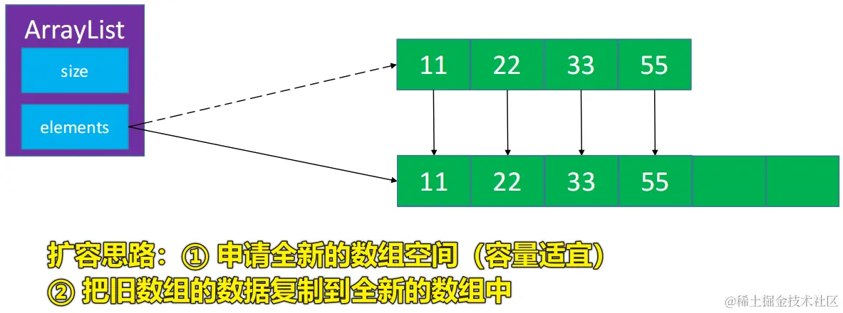 📖① 申请全新的数组空间(容量适宜) 📖② 把就数据的数据复制到全新的数组中 📔 添加的时候才会考虑扩容操作