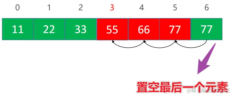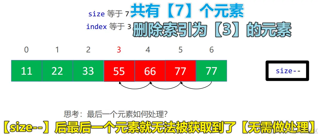 📙 思路:① 用后面的元素把要 删除的索引 index 位置的元素覆盖掉 📙 ② 数组 size 减 1 📙 ③ 如何覆盖❓ 遍历