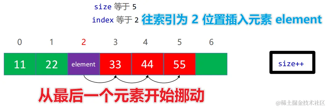 [index, size-1]】的元素往后挪动【空出 index 位置的元素】 🎁 把 element 元素赋值到 index 索引位置 🎁 从 索引为size - 1处开始挪动