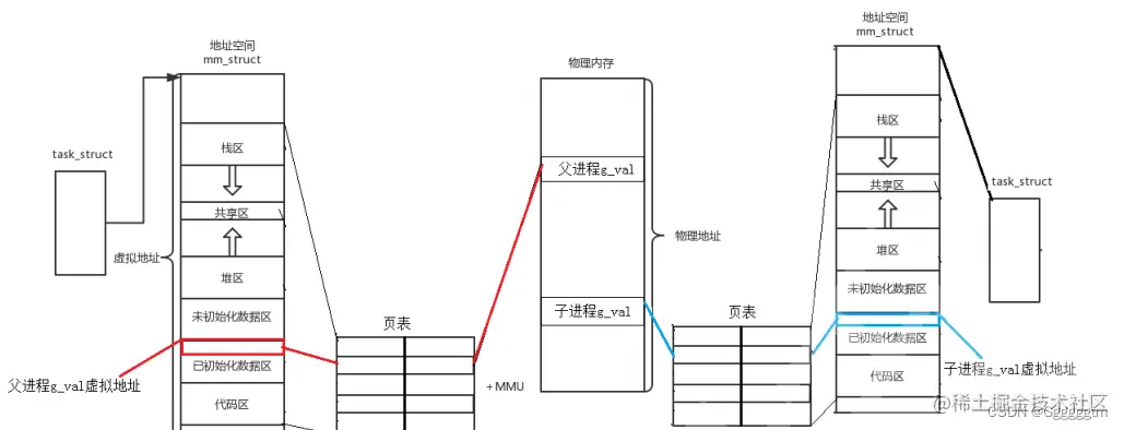 我们在上述的 1、2 中看到了相同的地址打印出不同的数据。注意, 我们所访问到的地址都是虚拟地址。并不是物理地址。在上述的 1、2 中我们创建了一个子进程, 子进程本身是继承了父进程的数据和代码。在没有对数据进行 修改之前,子进程和父进程共享了一份数据。一但对子进程或者父进程的 数据进行修改,就会发生写时拷贝。对 修改的数据进行深拷贝,从而达到对彼此不产生干扰,实现进程独立性。 那就对相同地址打印出不同数据的现象不难理解了。当我们对父进程的数据进行修改时,父进程发生了写时拷贝,在内存中开辟了空间。但他们 都有自己的地址空间(虚拟地址),所以 地址相同也是正常现象(子进程继承父进程的代码和数据)。即使虚拟地址一样,但是可 通过页表映射到不同的物理内存中。具体如下图: