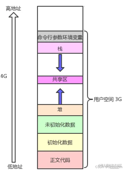 栈和堆之间有大量空间是空着的。 其次堆和栈是相向而生的。细心的小伙伴可能发现,总共的内存空间是4G,而用户空间只占用3G,那剩下的1G呢?其实完整的地址空间如下: