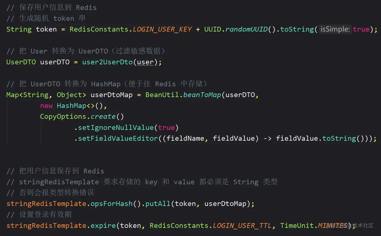 stringRedisTemplate.opsForHash().putAll(token, userDtoMap);