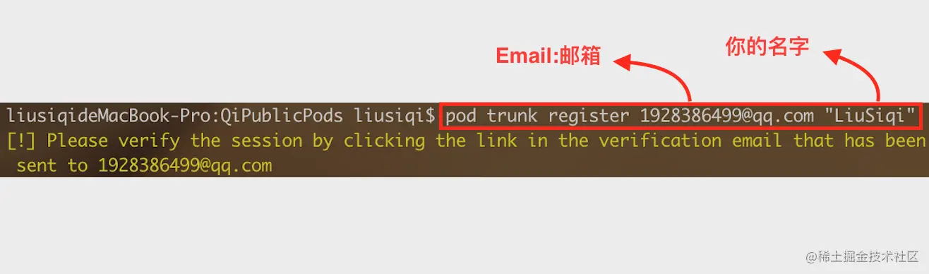 打开终端,使用命令:pod trunk register EMAIL [YOUR_NAME]。