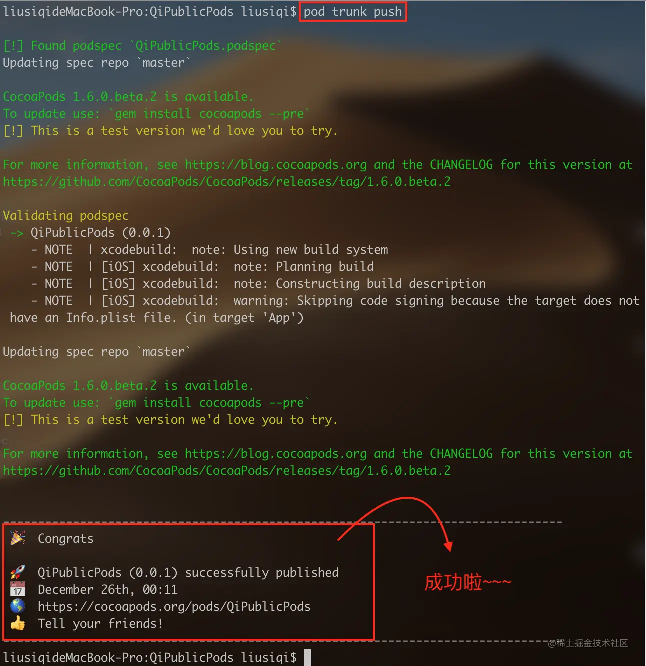 使用命令:pod search QiCocoaPods,结果如图:如果没搜到,更新一下本地的索引库即可。(删掉 ~/资源库/Caches/CocoaPods/search_index.json,再重新使用search命令)