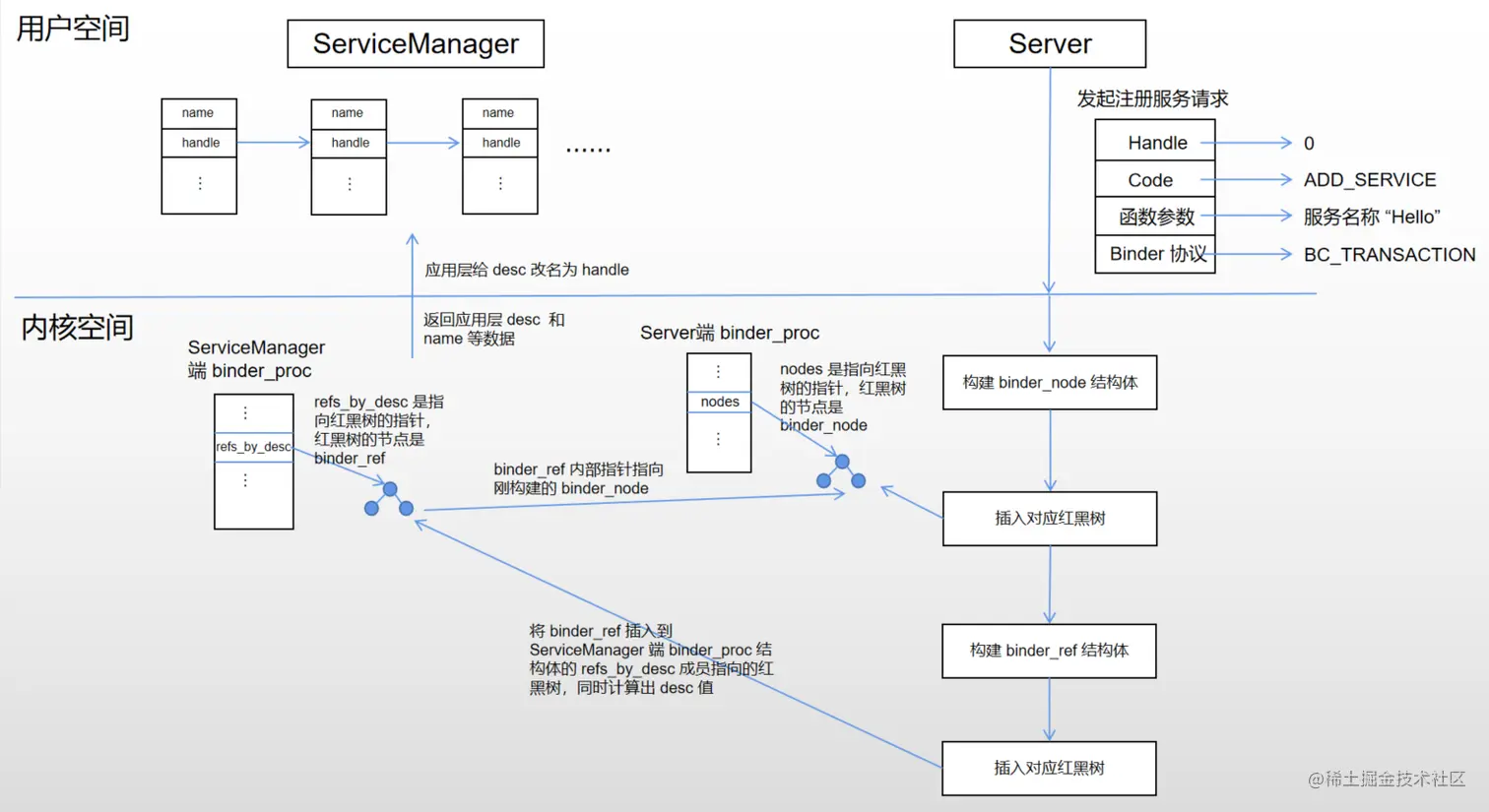 binder_proc->refs_by_desc红黑树中,同时会计算出一个 desc 值(1,2,3 ....依次赋值)保存在 binder_ref 中。 - 最后服务相关的信息(主要是名字和 desc 值)会传递给 ServiceManager 应用层,应用层通过一个链表将这些信息保存起来