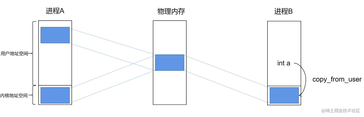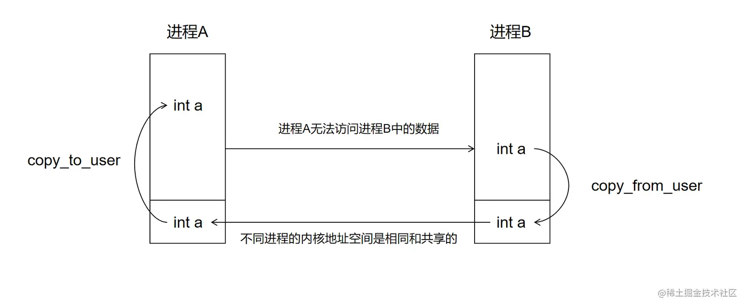具体地,我们在 B 进程使用 copy_from_user 内核函数将用户态数据 int a 拷贝到内核态,这样就可以在 A 进程的内核态中访问到 int a