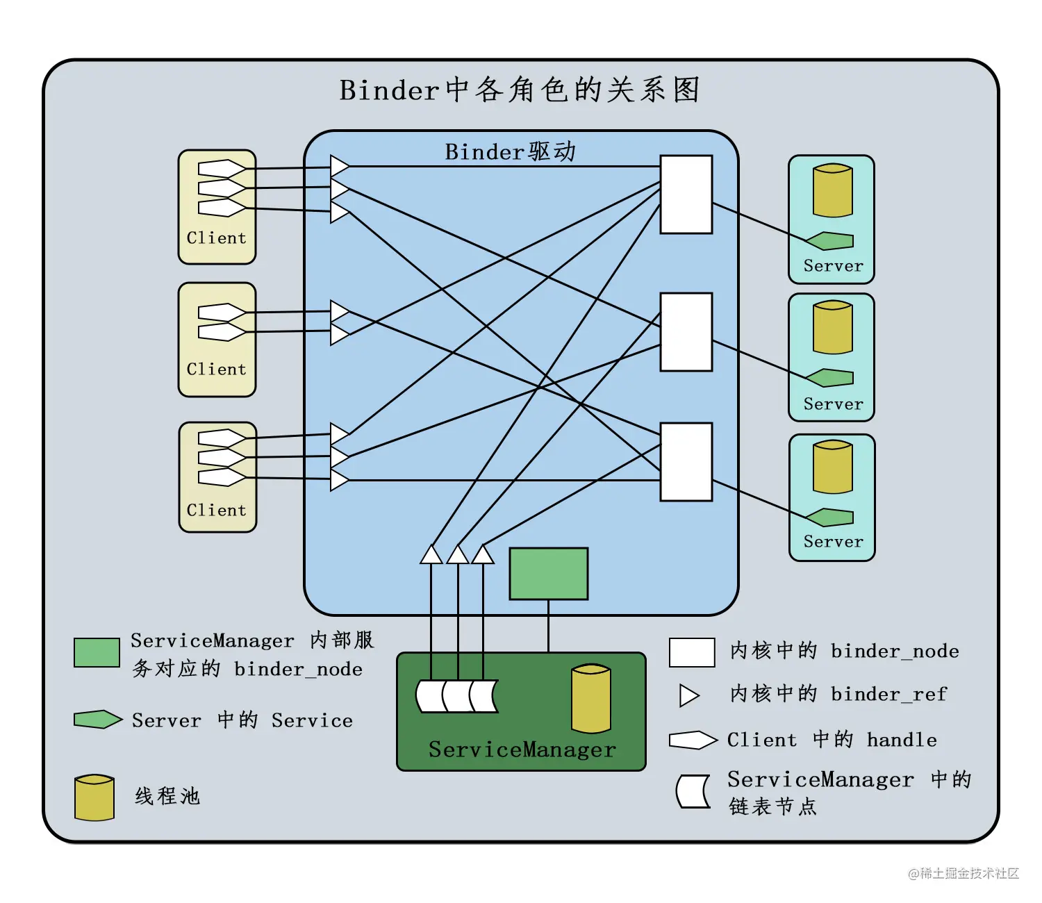 在上图中,ServiceManager 在 Binder 驱动中有对应的的一个 binder_node(Binder 实体)。每个 Server 在 Binder 驱动中也有对应的的一个 binder_node(Binder 实体)。这里假设每个 Server 内部仅有一个 service,内核中就只有一个对应的 binder_node(Binder 实体),实际可能存在多个。