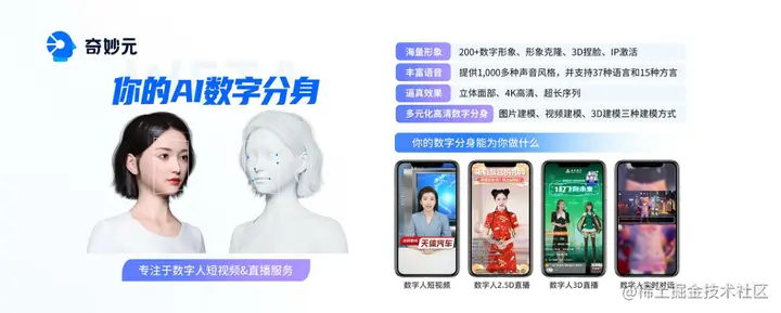 「奇妙元」是一款AI数字形象创作及直播软件,已为等数百家行业客户提供数字形象定制服务。「奇妙元」提供包括“一张照片驱动”、“2.5D真人克隆”、“3D定制及IP活化”等多种数字形象克隆方案,使用一站式数字形象编辑器,让企业能够像做PPT一样轻松制作数字人视频和直播。