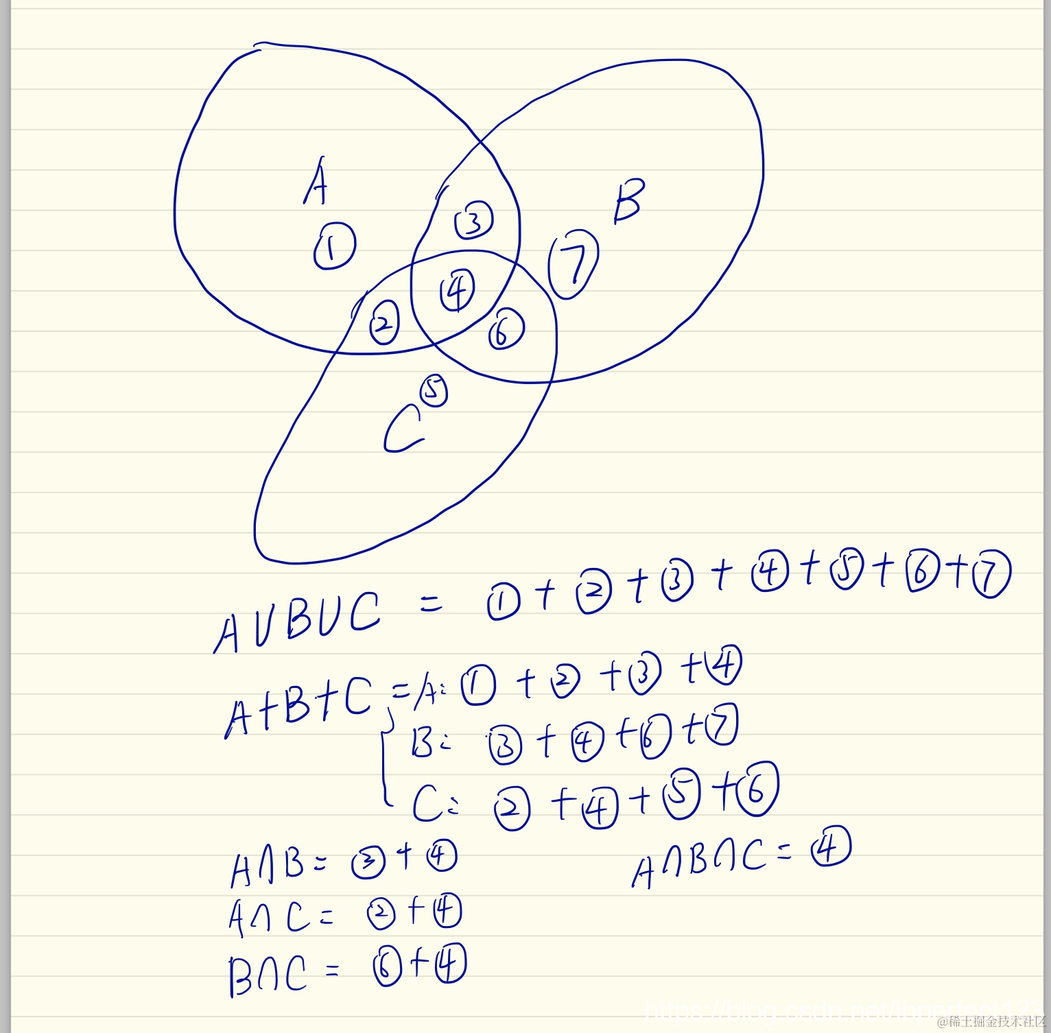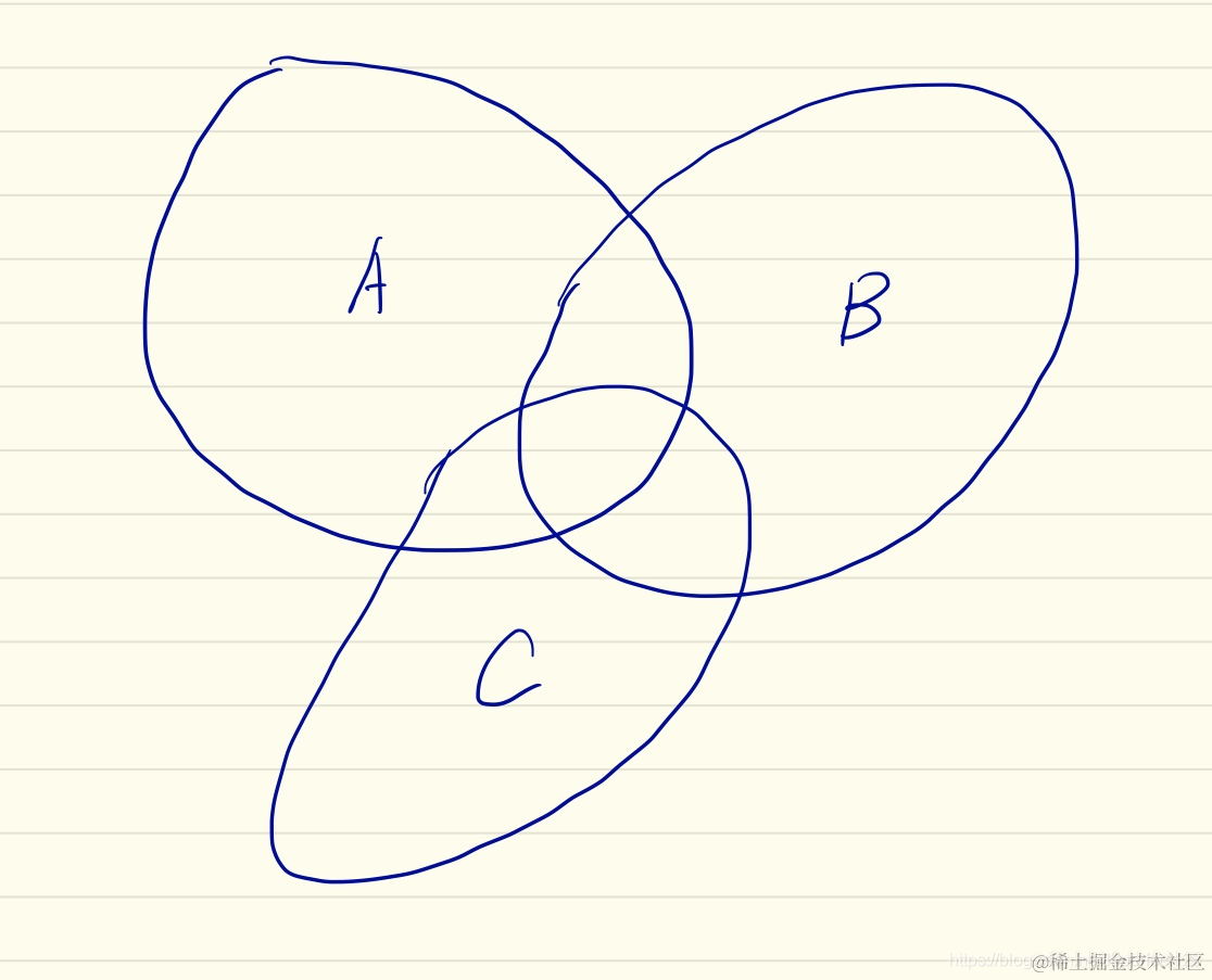 这样我们可以直观的看到,A,B ,C的并集可以看成A,B,C三个集合相加,这样就多加了一次任意两个集合的交集,故把任意两个集合的交集减掉,但是我们在减的过程中也把中间相交的部分也减掉了,故我们要加上这一部分的值,
