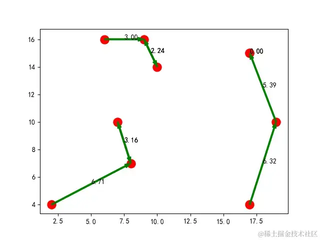 下面的代码,首先随机生成10个二维坐标点,然后使用plt.scatter标出他们的位置。然后在一个for循环中依次查找出与他们最近的点(自身除外),并在两者之间使用plt.arrow添加一个带箭头的连线。最后在连线的中心处使用plt.text标注这个距离值。