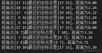 print('距离点{}最近的坐标点是{},距离为{:.2f}'.format(point,points[indexs[1]],distances[1]))