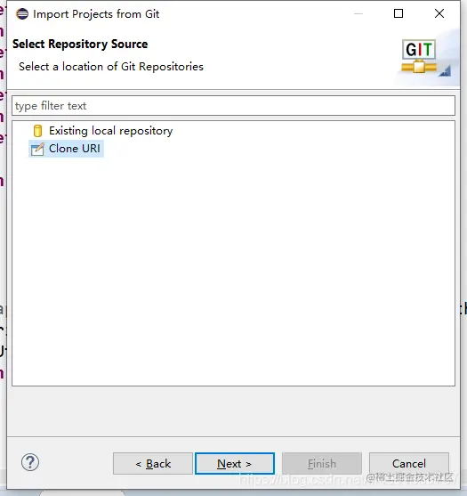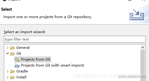 3.从Eclipse中选择File->import->Git->Projects from Git。