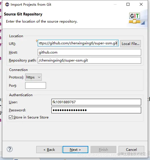 5.在GitHub需要的项目里面按Clone复制地址下来粘贴到URL那一栏,USER和Password处输入GitHub账号密码,Next。