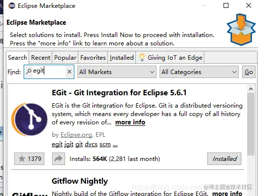 2.Eclipse安装egit插件:在Eclipse中选择help->Eclipse Marketplace,在search中输入egit,找到后安装。