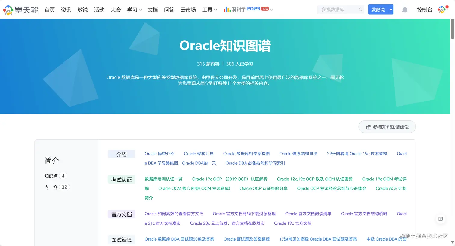 墨天轮Oracle知识图谱将Oracle的不同技术要点通过精心整理和归类,按照合理的架构和脉络进行呈现,共分为简介、原理知识、新特性、安装部署、升级、巡检、基础运维、数据安全、故障处理、性能优化、迁移等 11 个一级框架,下设 51 个知识点(二级框架),当前共计收录了 315 篇墨天轮上优质的相关主题文章/文档。