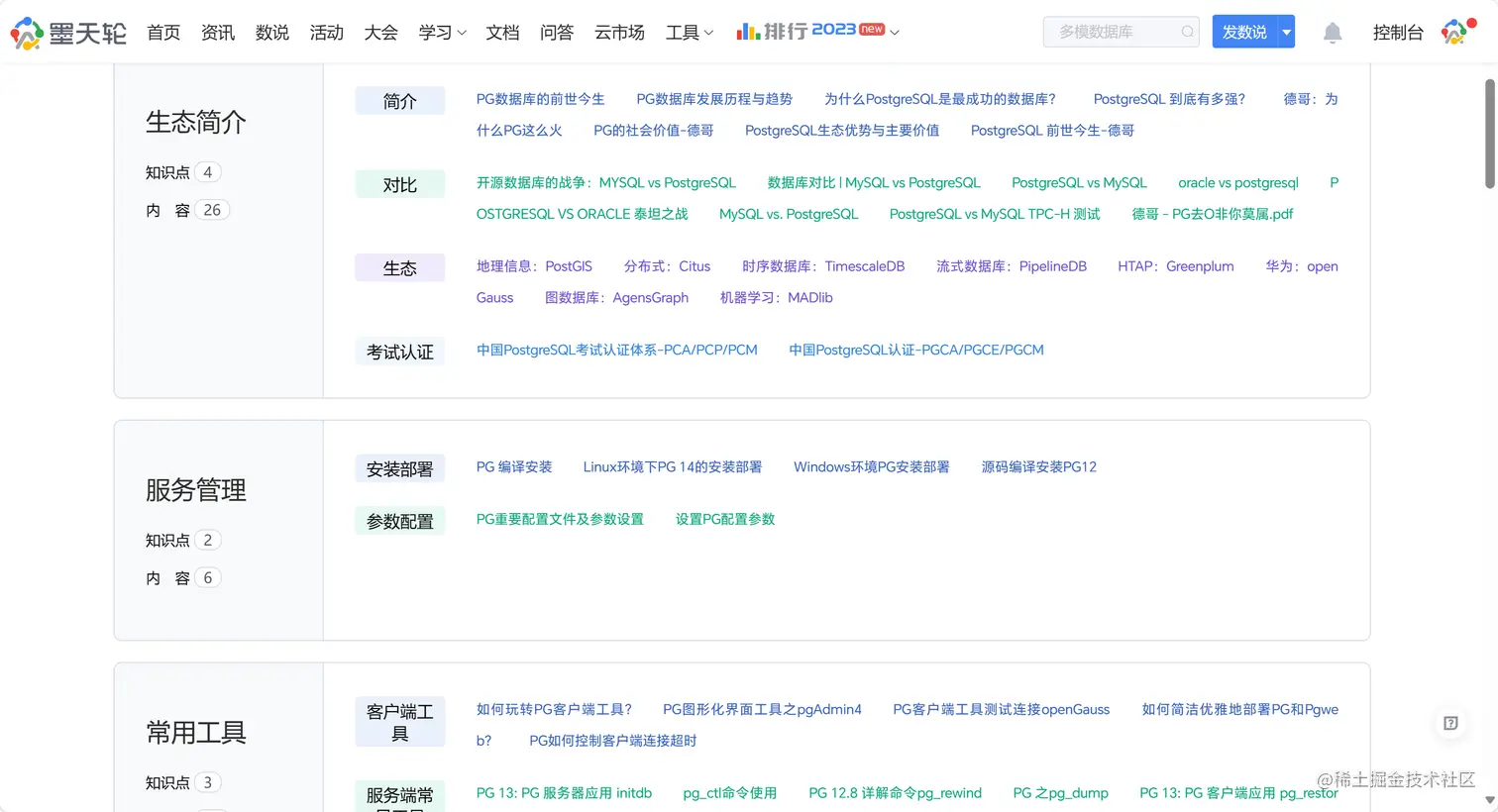 现涵盖PostgreSQL数据库从生态简介、服务管理、常用工具、扩展插件、应用开发、性能优化、安全加固、高可用、分布式、新特性以及内容原理 11 个大类的相关知识,包含安装部署、性能调优、执行计划、审计安全、数据库脱敏等 56 个二级知识点的 196 篇相关优质内容。