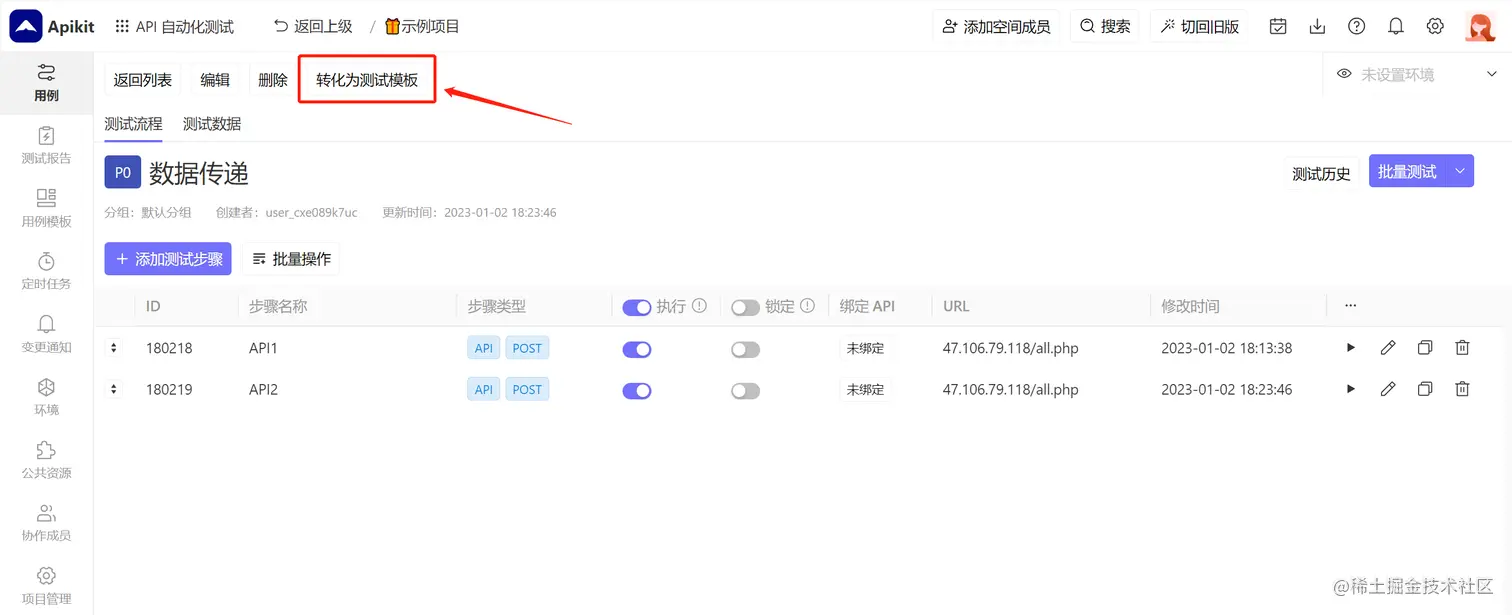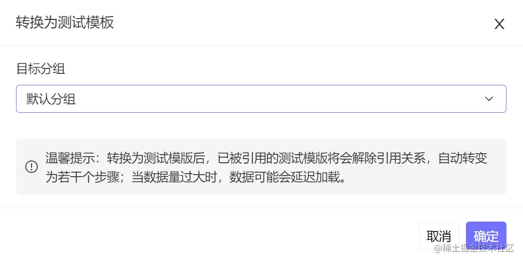 提示:转换为测试模板后,已被引用的测试模板将会解除引用关系,自动转变为若干个步骤