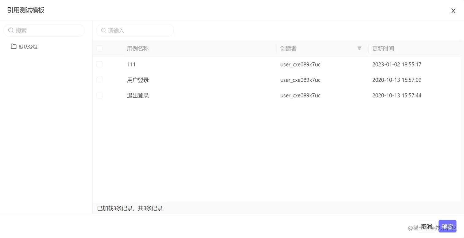 测试模板的创建和测试方式与普通的测试用例一致,当您创建好测试模板之后,可以在流程测试用例页面,点击引用测试模板按钮,在弹窗中选择需要引入的测试模板即可: