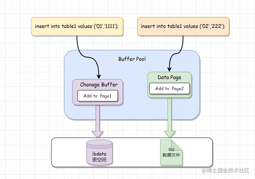 执行两条Insert语句,其中左侧的要更新的数据页 Page1 不在Buffer Pool,而右侧需要更新的数据页Page2在Buffer Pool缓存中。