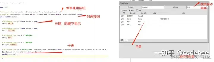 OneCode 支持开发者,在Java类、方法、字段属性以及构造函数上添加相应的注解。在类直接上直接添加@RequestMapping 直接声明可以将一组方法声明为Web可访问,也可以添加@GridAnnotaion @FormAnnataion等注解将当前实体声明为列表或者视图渲染。同样服务的方法注解上,可以添加与方法对应的动作、事件、服务来实现对应领域事件及服务调度的注册。而对于树形对象、容器组件等应用组件需要动态装载或者符合构建的实体则通过在构造函数上添加对象声明周期管理的相关注解。
