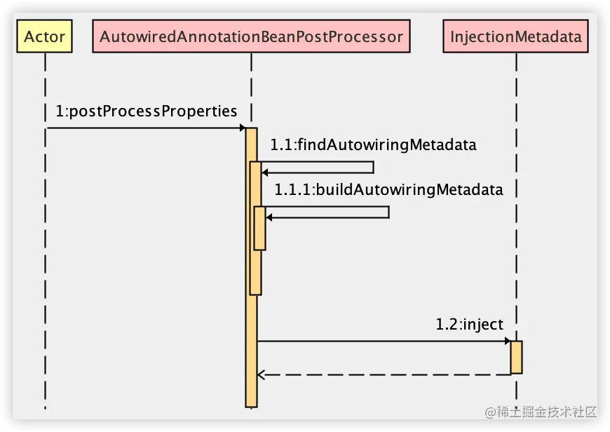 - 在第 3 步的方法中,调用 findAutowiringMetadata,这个方法又会进一步触发 buildAutorwiringMetadata 方法,去找到包含了 @Autowired、@Value 以及 @Inject 注解的属性或者方法,并将之封装为 InjectedElement 返回。