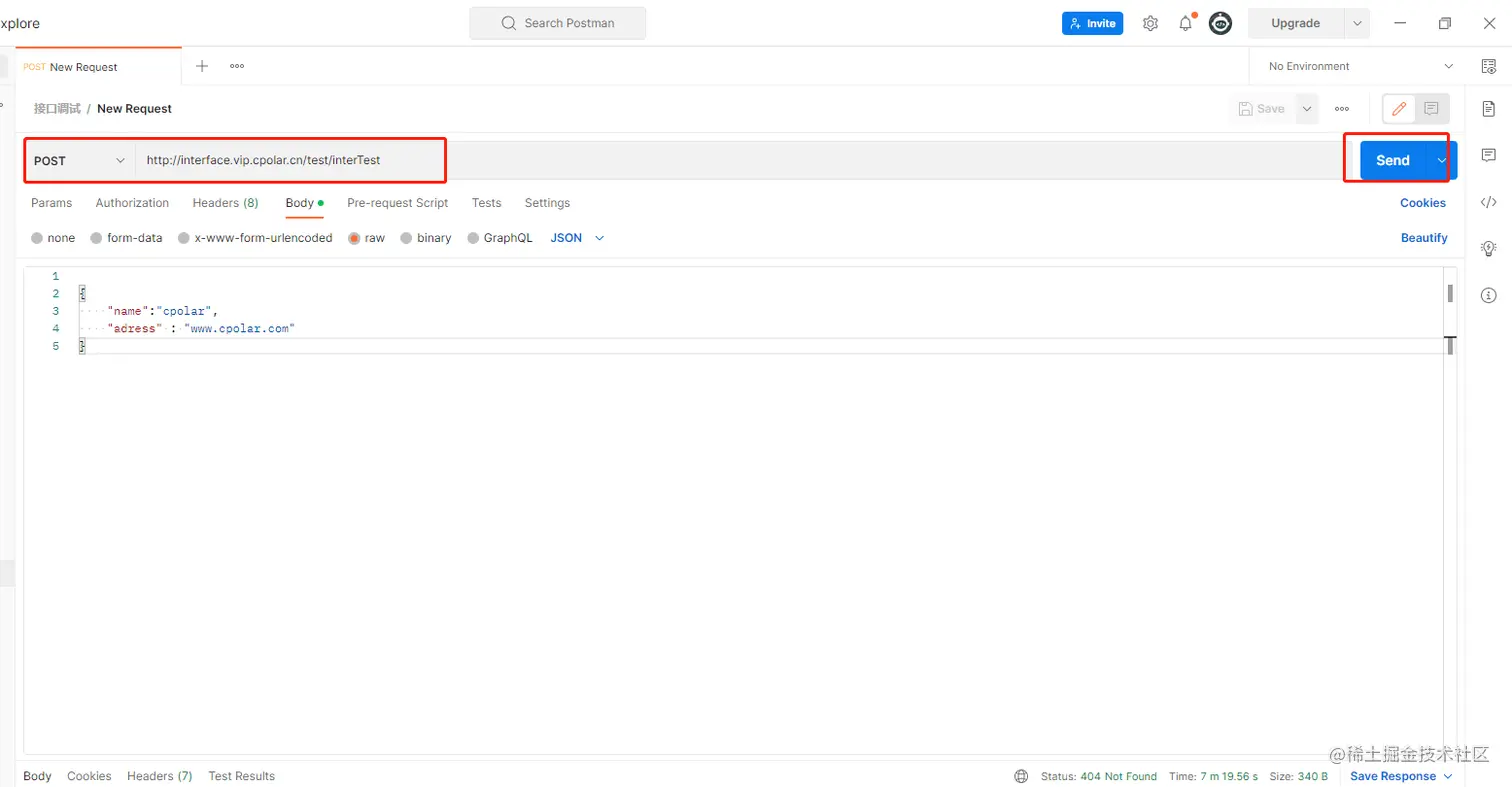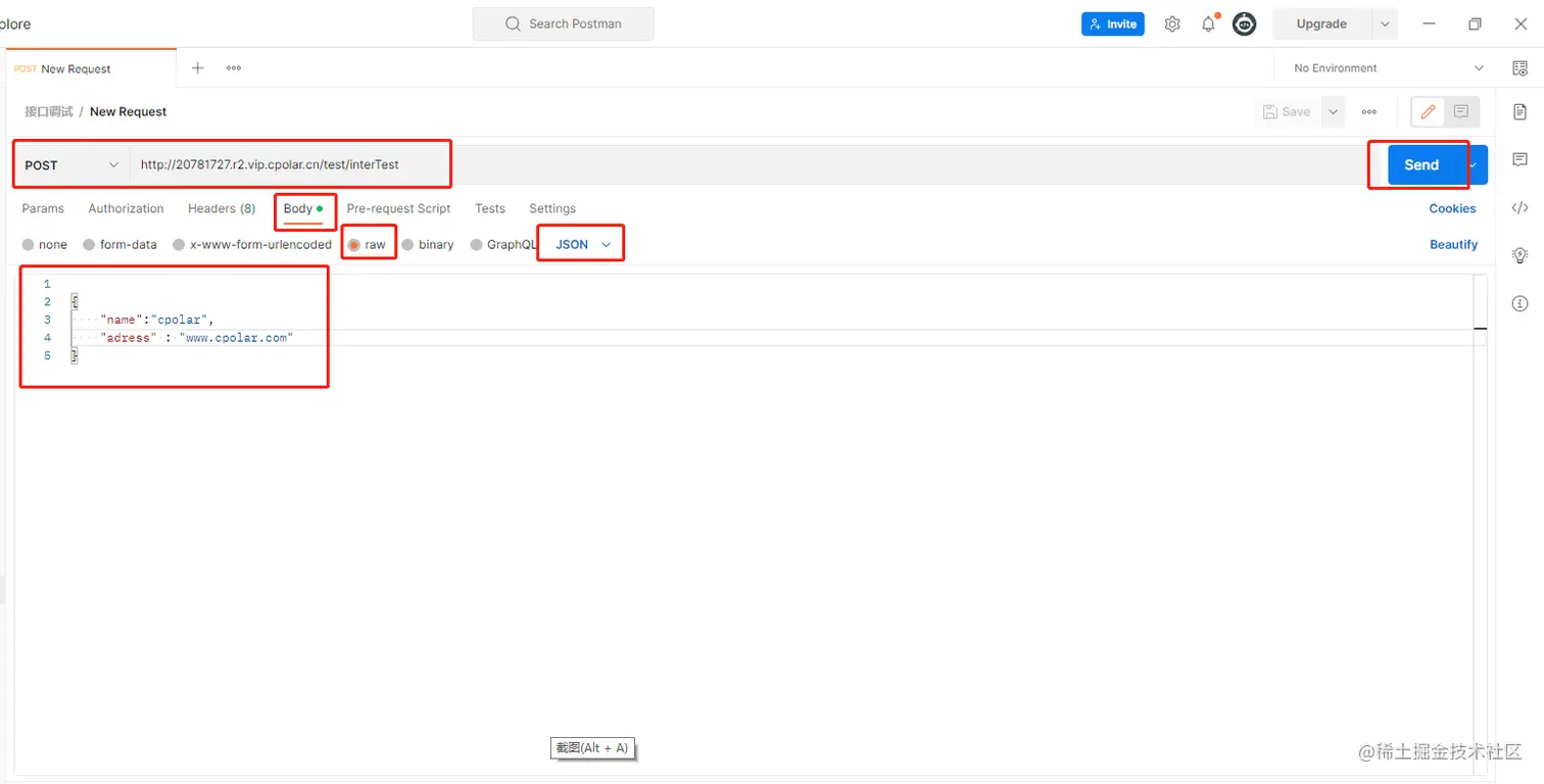 这里以Postman接口调试工具向接口发送请求,在postman创建一个post请求方式.输入复制的公网地址加上接口路径,参数使用JSON格式,设置好参数点击