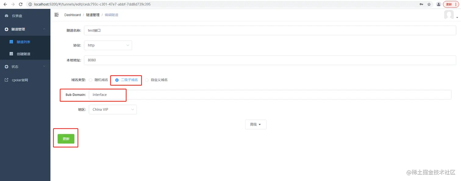 修改隧道信息,将保留成功的二级子域名配置到隧道中