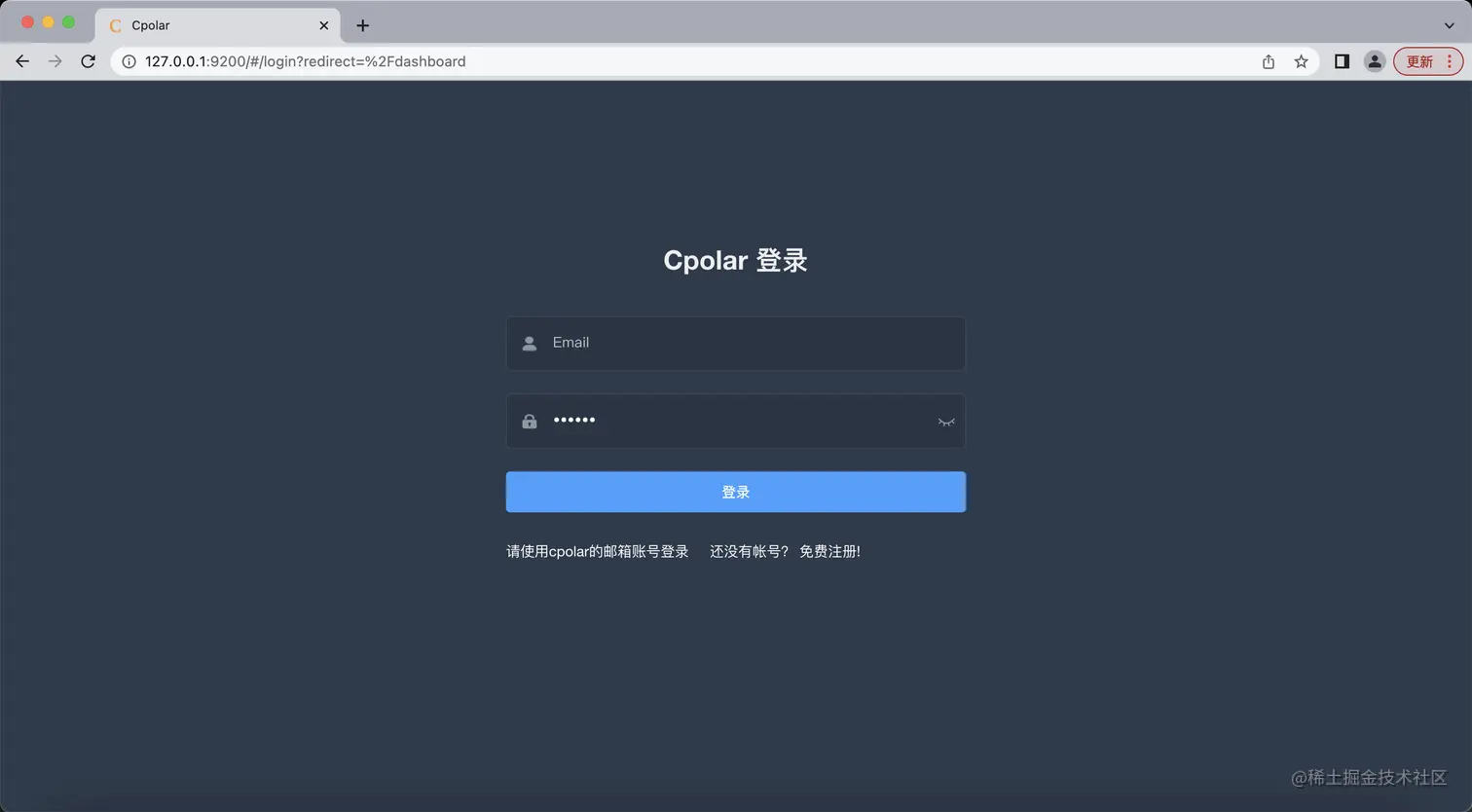 cpolar安装成功后,在浏览器上访问本地9200端口【http://localhost:9200】,使用cpolar账号登录。