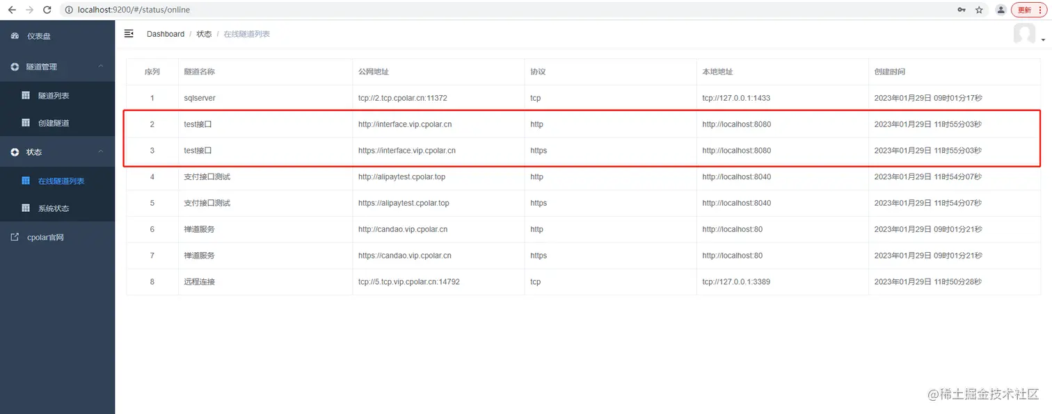 更新完成后,打开在线隧道列表,此时可以看到公网地址已经发生变化,地址名称也变成了保留过的二级子域名名称,将其复制下来