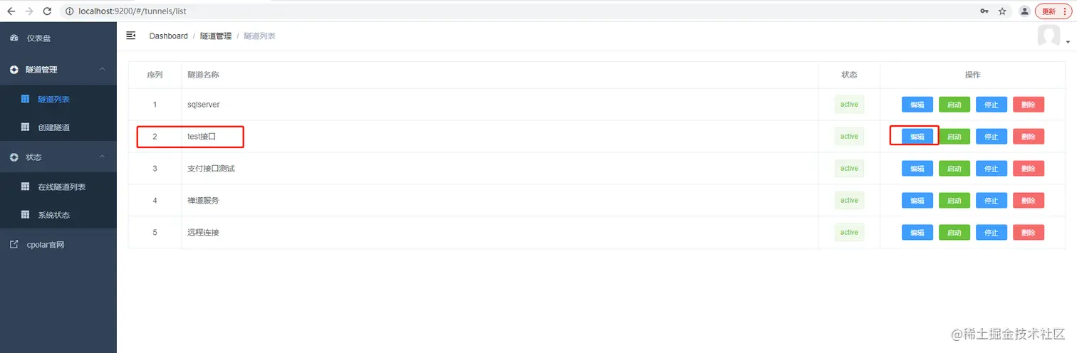 选择我们刚刚创建配置的http隧道,并点击右侧的 编辑
