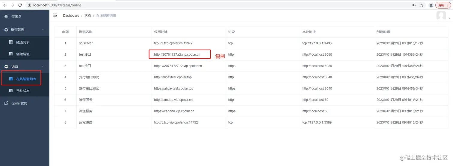 隧道创建成功后,点击左侧的状态——在线隧道列表,查看所生成的公网地址,然后复制地址