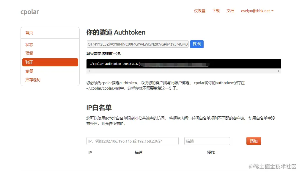登录cpolar官网后台,点击左侧的验证,查看自己的认证token,之后将token贴在命令行里