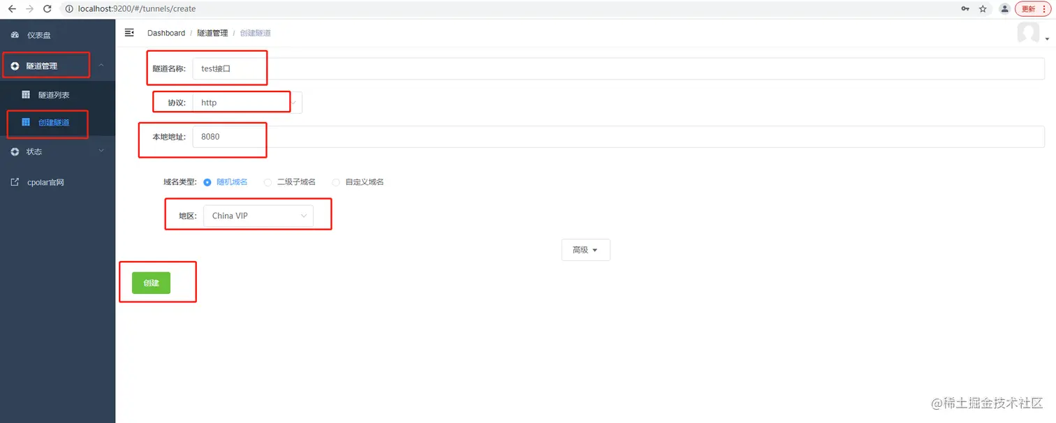 点击左侧仪表盘的隧道管理——创建隧道,创建一个tomcat的8080端口 http隧道