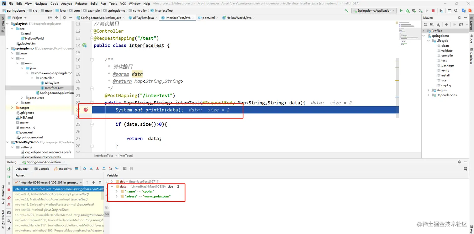 同样在服务端debug调试查看请求是否进入接口,进入接口表示成功