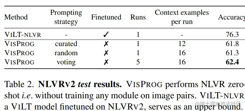 VisProg完成该任务的时候同样没有训练模型,GPT3得到执行步骤后,使用的是VILT-VQA+python运算。