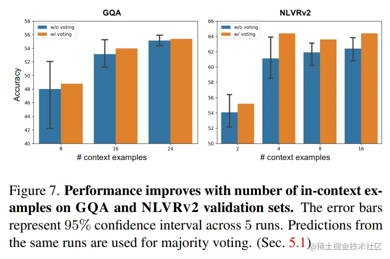 - context examples的数量对性能的影响,在NLVRv2任务上更容易达到的饱和。 原因是NLVRv2任务相对比较简单,需要的步骤比较少,因此用较少的context就能取得不错的效果