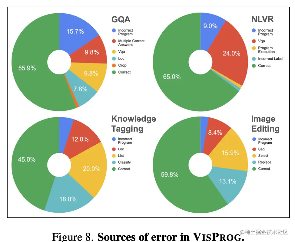 理解了论文中的Figure.1的图,就会发现是一个简单粗暴有效的方法。甚至我刚开始看的想着可能会有些其他的东西,但算法的设计上确实没太多可以讲的。VisProg将一个具体问题拆解成Python语言的形式很巧妙,因为编程实际上也是一种思维方式, 把一个复杂的问题,拆解成一步步可以用代码解决的问题。 而且简单有效并不是坏事, 这篇更多的是关于实际问题的思考方式, 和作者关于通用人工智能实现方式的尝试。
