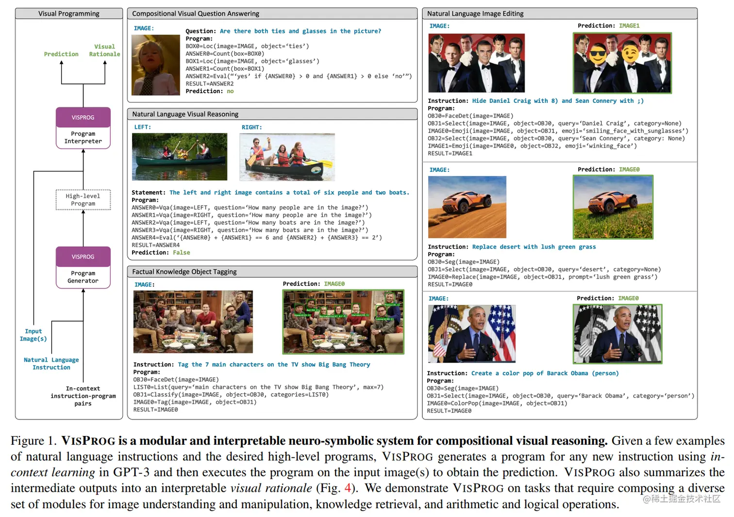 VisProg是一个模块化且可解释的视觉系统. 使用GPT3的语言理解和规划能力,将自然语言指令分解为具体的一些步骤,使用训练好的模型、图像处理代码和数学逻辑运算,执行拆解的步骤,以完成自然语言指令的任务。 VisProg结构和可视化效果如下图所示: