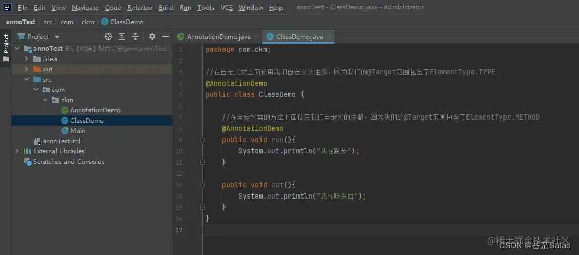 - 通过clazz.getAnnotation判断该类上是否使用了@AnnotationDemo自定义注解。