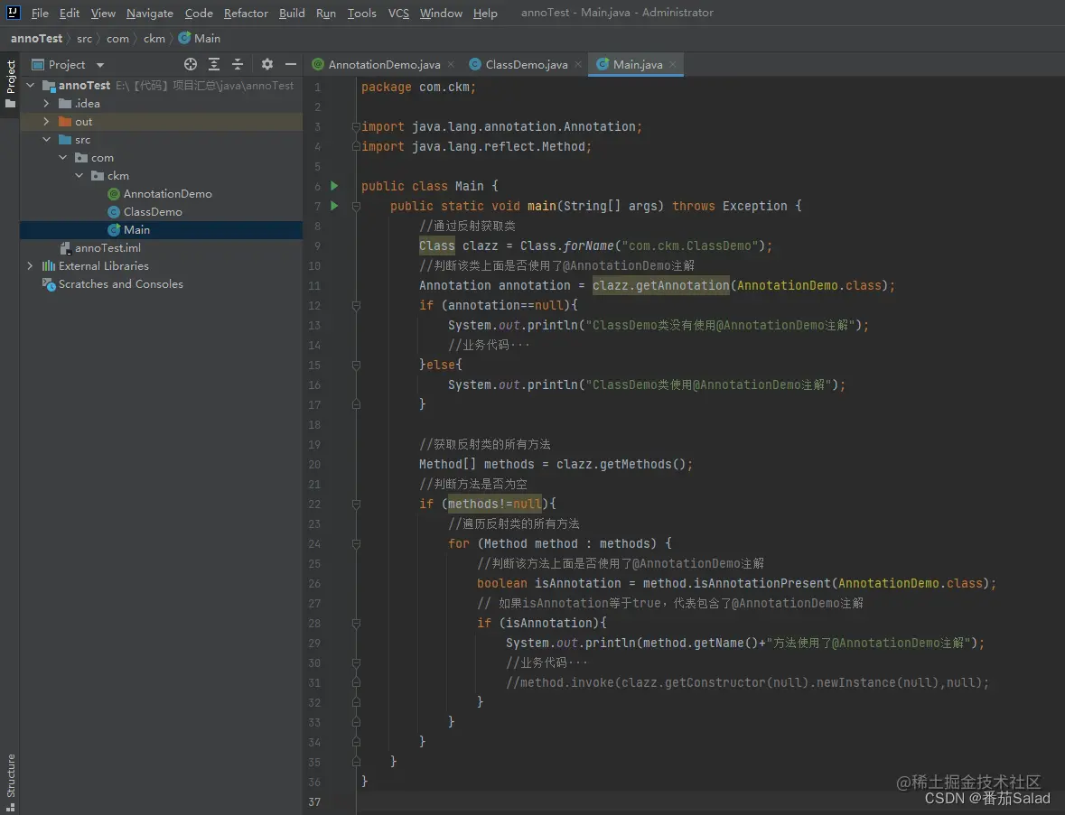 - 遍历后通过method.isAnnotationPresent判断该方法上是否使用了@AnnotationDemo自定义注解。